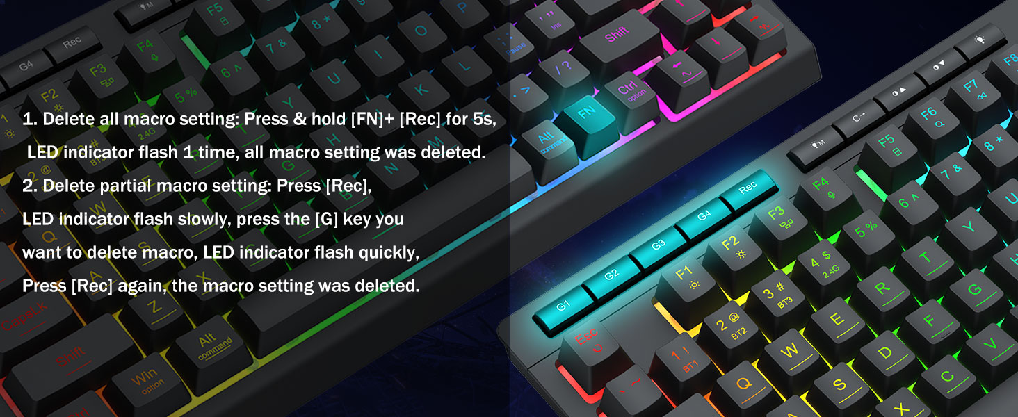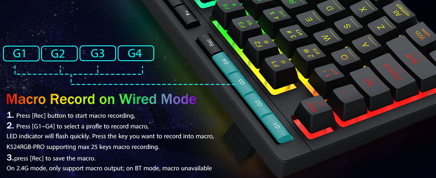 وحدات ماكرو قابلة للتخصيص، تحكم سهل- قم ببرمجة مفاتيح الماكرو الأربعة الموجودة على اللوحة (G1-G4) على الفور - دون الحاجة إلى برامج. قم بتسجيل المجموعات المعقدة للألعاب أو اختصارات الإنتاجية أو أوامر الوسائط. أعد تعريف سير عملك في ثوانٍ. يمكنك أيضًا استخدام البرنامج لتخصيص الوظائف وإنشاء وحدات الماكرو وضبط أضواء RGB وتعيين الاختصارات.