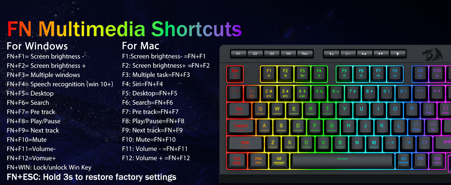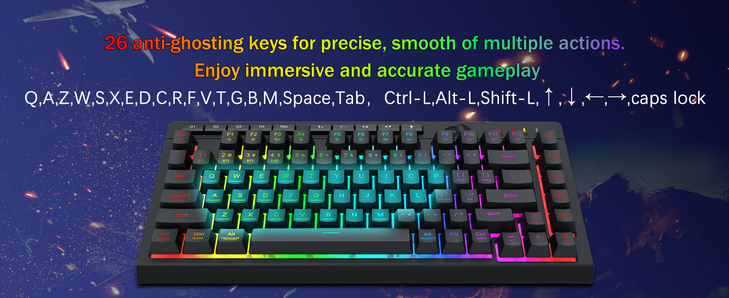 أداء ألعاب احترافي وعناصر تحكم مخصصة بإضاءة خلفية- تتميز بمفاتيح مضادة للظلال (مفاتيح ذات شرطة سفلية) تسمح لـ 26 مفتاحًا بالعمل في وقت واحد للحصول على استجابات سريعة ودقيقة للعبة بالطريقة التي تريدها. أزرار الوصول السريع للسطوع ووضع الإضاءة ووضع الألعاب لضبط السطوع وملفات تعريف الإضاءة بسرعة وتمكين وضع اللعبة بلمسة زر واحدة.