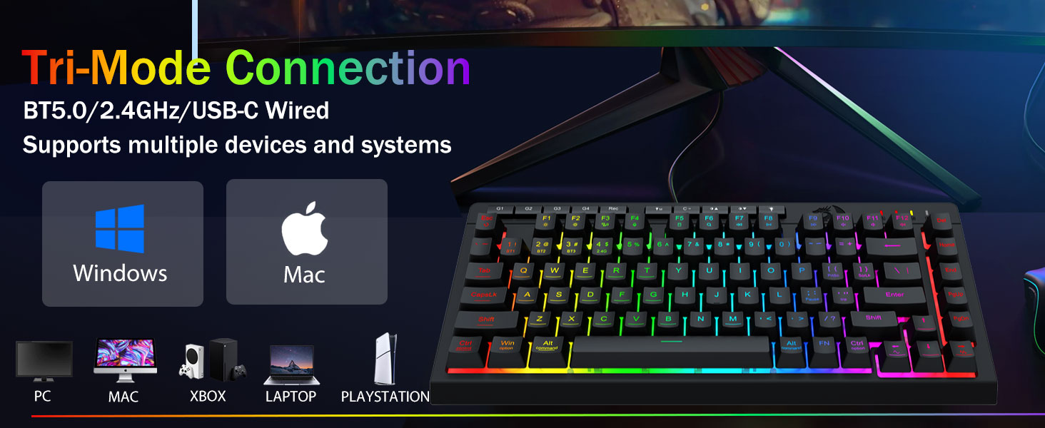 تعدد الاستخدامات ثلاثي الأوضاع وإتقان الأجهزة المتعددة- قم بالتبديل بسلاسة بين أوضاع Bluetooth 5.0 أو 2.4 جيجا هرتز اللاسلكية أو USB-C السلكية، وتوصيل ما يصل إلى 5 أجهزة في وقت واحد (الكمبيوتر الشخصي، Mac، الأجهزة اللوحية، الهواتف، PS/XBOX).