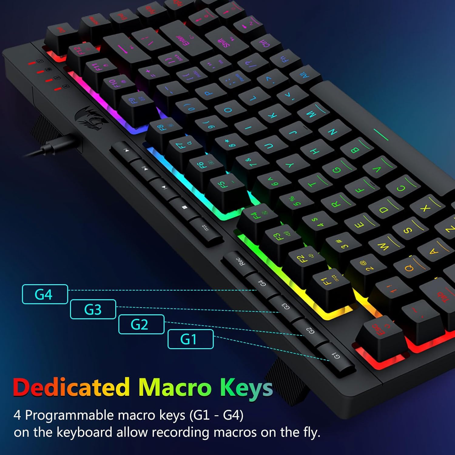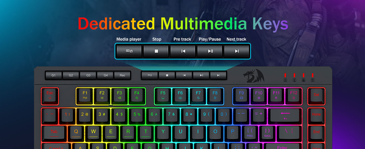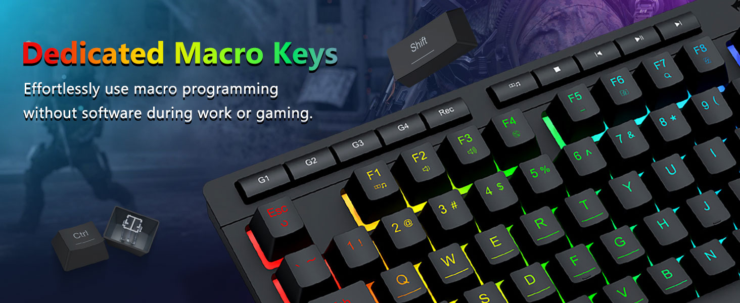 【فعالة ومريحة】تم تجهيز مجموعة لوحة مفاتيح الألعاب والماوس هذه بـ 4 مفاتيح ماكرو على اللوحة، و5 مفاتيح وسائط متعددة مستقلة و12 مفتاح وظائف الوسائط المتعددة FN، وهي بسيطة ومريحة في التشغيل. فهو لا يعمل على تحسين الكفاءة فحسب، بل يجعل عملية اللعب الخاصة بك أكثر ملاءمة وأسرع أيضًا