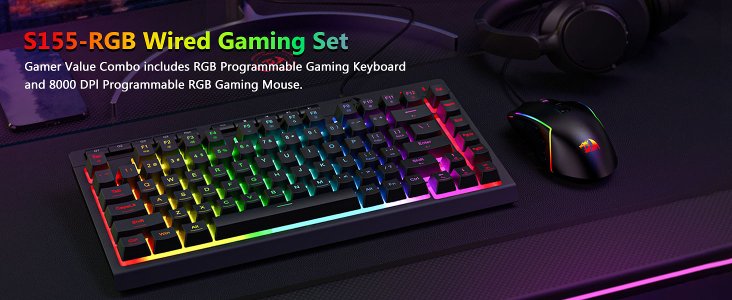 مجموعة لوحة مفاتيح وماوس سلكية للألعاب بإضاءة خلفية باللون الأسود S155 RGB