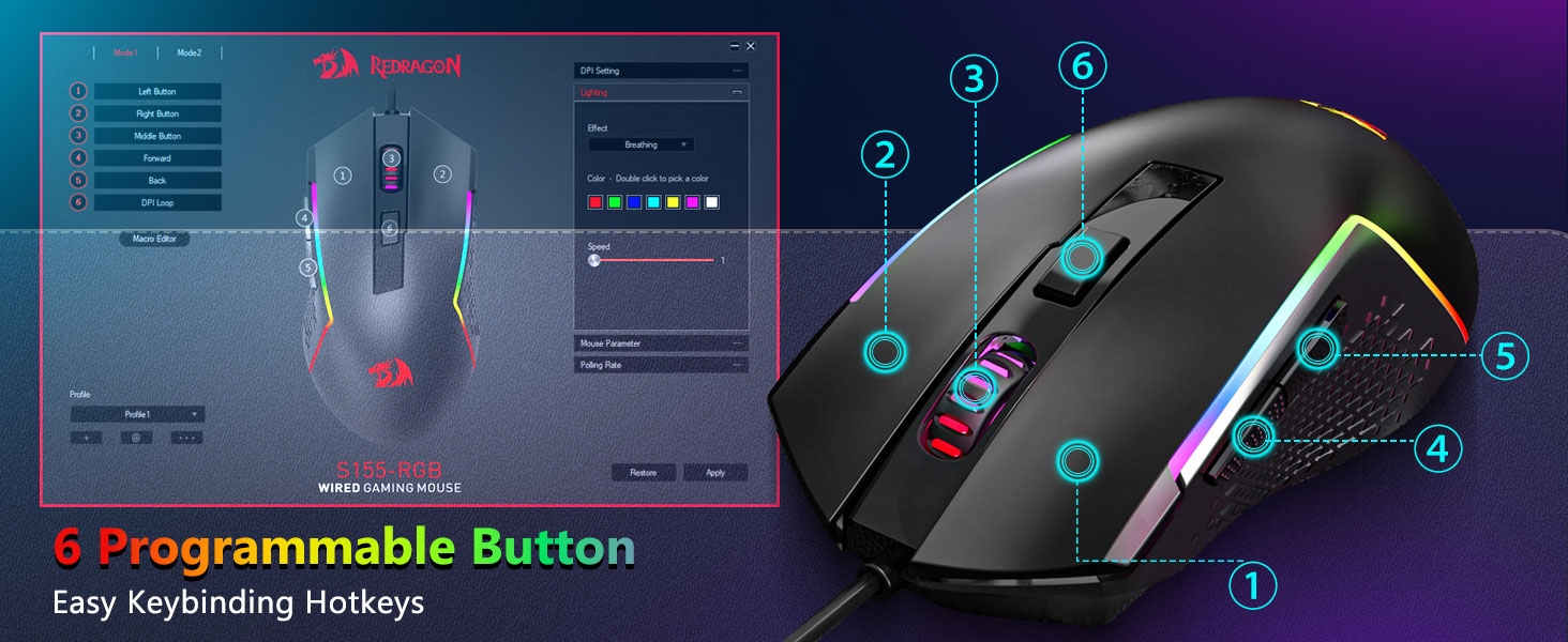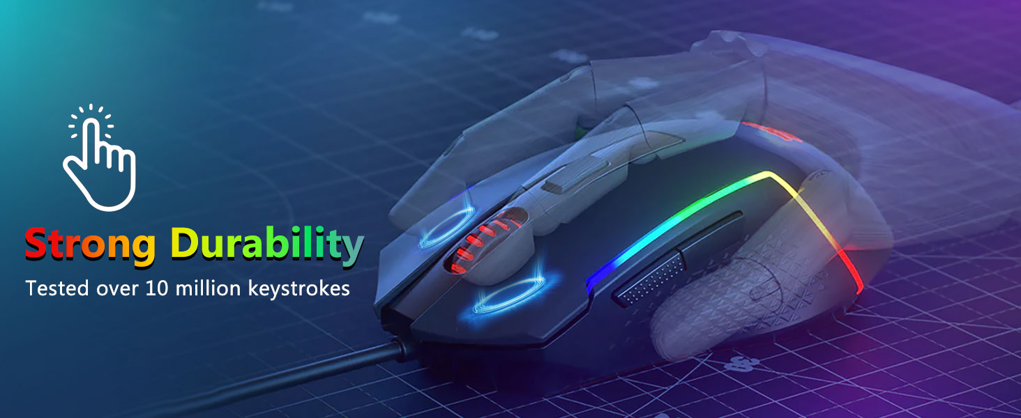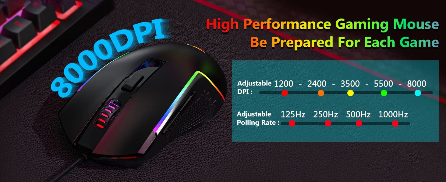 【ماوس ألعاب احترافي】يمكنك ضبط DPI من 1200 إلى 8000 عبر زر DPI أو من 100 إلى 8000 عبر برنامج التشغيل لتلبية احتياجاتك المختلفة في الألعاب أو العمل بسهولة. إجمالي 7 أزرار منها 6 قابلة للبرمجة. يوفر المستشعر عالي الدقة دقة بالغة بينما تضمن المفاتيح الصغيرة من فئة الألعاب طول العمر ومتانة أكبر واستجابة قصوى، مما يمنحك ميزة أكبر على منافسيك. (يدعم البرنامج أيضًا ضبط معدل استقصاء الماوس حتى 1000 هرتز)