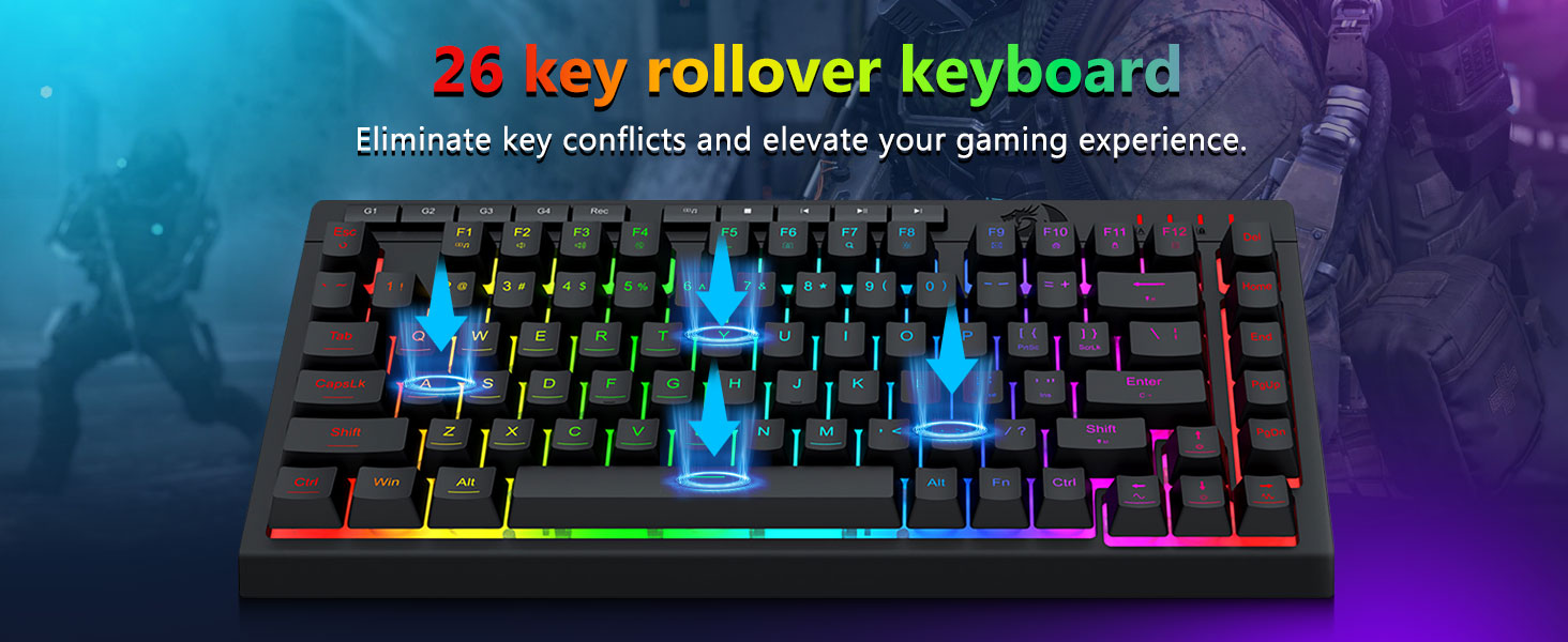 【ألعاب مريحة】يعمل حامل لوحة المفاتيح القابل للطي، والطلاء الملائم للبشرة، وأغطية المفاتيح العائمة على زيادة راحة الكتابة. 26 مفتاحًا مضادًا للظلال يضمن إمكانية تشغيل كل زر. يمكن تعطيل مفتاح WIN للألعاب. تم تخصيص لوحة المفاتيح والماوس لتوفير تجربة لعب فعالة مع ضمان أقصى قدر من الراحة